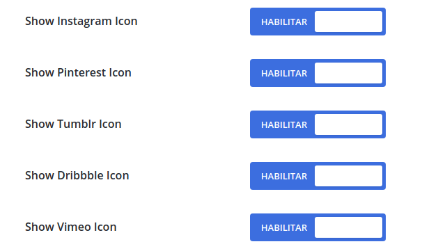 Desça a página até encontrar as opções para habilitar/desabilitar os novos ícones. Além dos quatros ícones citados no começo deste post, o tema filho inclui as seguintes redes sociais.: Youtube, Instagram, Pinterest, Tumblr, Dribbble, Vimeo, LinkedIn, MySpace, Skype, Flickr.