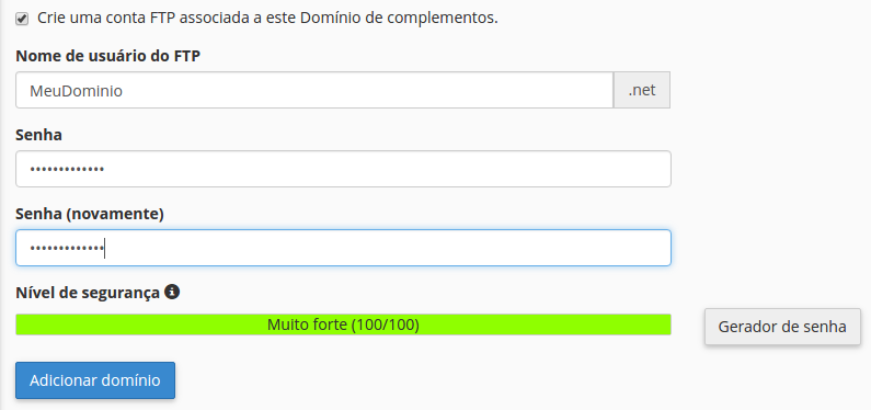 Caso tenha conhecimento de FTP e queira criar uma conta para o seu domínio deve clicar na caixa Crie uma conta FTP associada a este Domínio de complementos que ira habilitar os campos referentes a cadastro da conta.Automaticamente o nome de usuário já estará preenchido de acordo com o domínio colocado anteriormente. Basta colocar a senha que já utiliza para finalizar a configuração do cadastro.