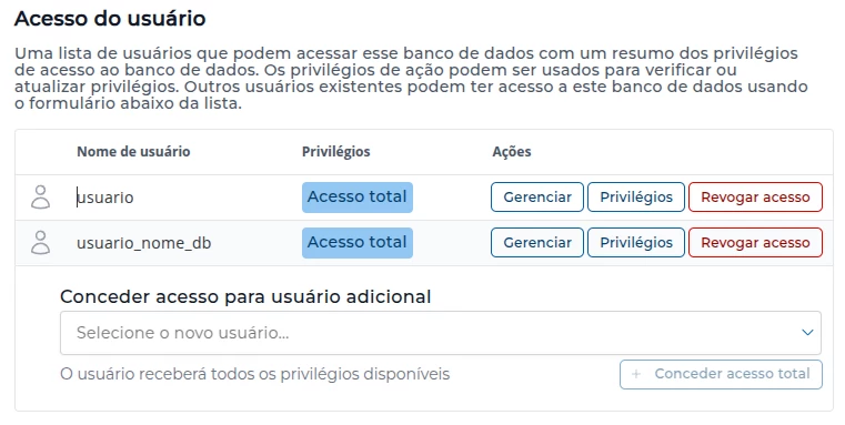 Nesta seção, você encontrará uma lista de usuários que possuem acesso ao banco de dados, juntamente com um resumo de seus privilégios. Os privilégios de ação permitem verificar ou modificar as permissões de cada usuário. Além disso, é possível conceder acesso a outros usuários utilizando o formulário disponível abaixo da lista.