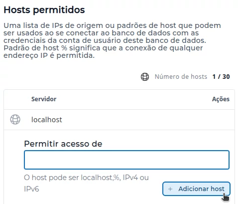 Dentro da opção Gerenciar, há a seção Hosts Permitidos, que exibe uma lista de IPs de origem ou padrões de host autorizados a se conectar ao banco de dados usando as credenciais da conta de usuário. O padrão de host %