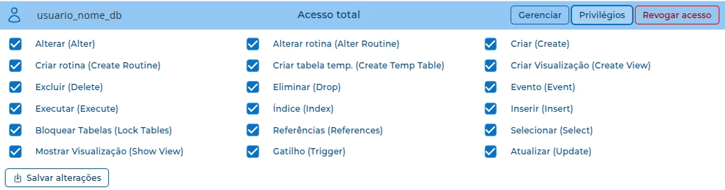 - Privilégios: Possibilita editar as permissões do usuário sobre o banco de dados.