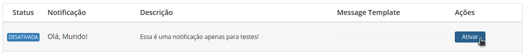 Na página dos módulos complementares, procure na tabela o módulo Notificação WhatsApp. Depois, clique no botão Ativar.
